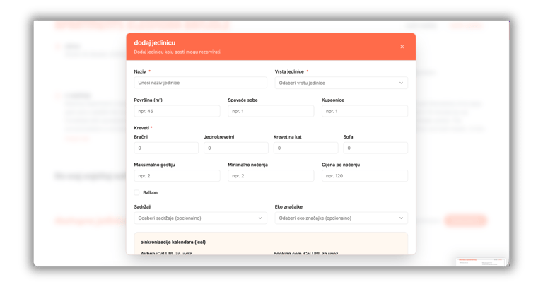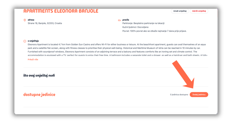 Kako biste mogli primati rezervacije, prvo je potrebno dodati smještaj, a zatim unutar njega kreirati barem jednu jedinicu (apartman, studio, kuću i sl.).