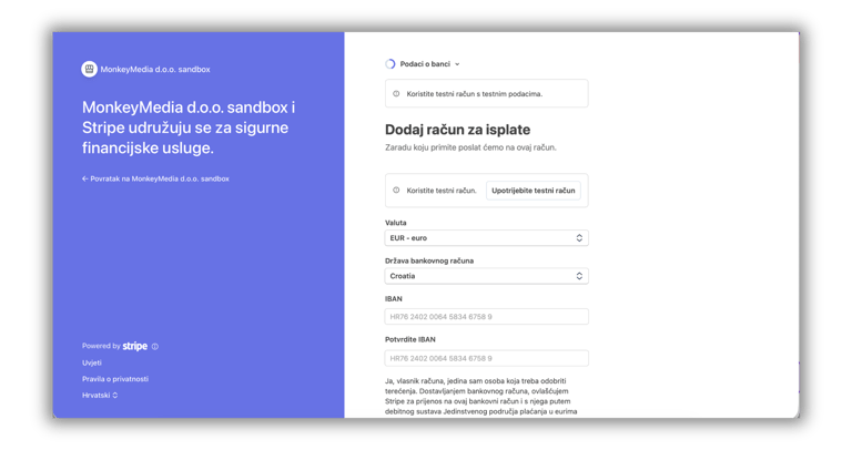 Stripe će koristiti ovaj račun za isplate rezervacija.